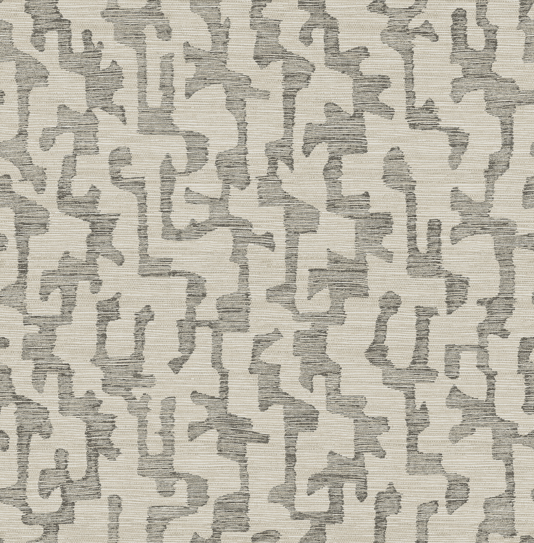 Faux grasscloth detailing adds depth and elegance to Cipher’s abstracted and maze-like forms. Featured here with black shapes against a taupe backdrop. Cipher is an unpasted, non woven wallpaper measuring 20.5 inches wide by 33 feet long, covering approximately 56.4 square feet per roll.
