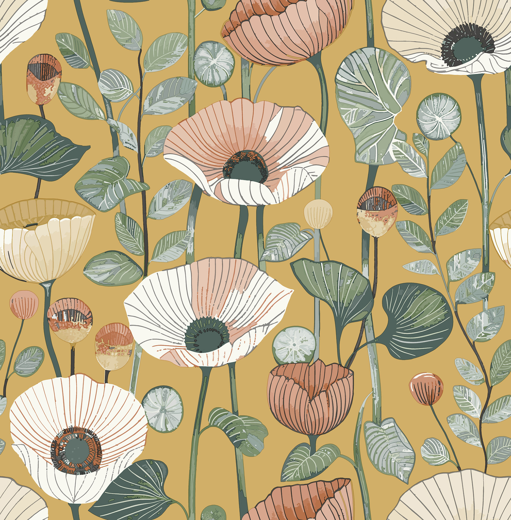 Elegant anemones bloom amidst lush stalks of greenery in this stylized and attention-grabbing floral wallpaper. Illustrated in a palette of white, blush, pink, green, and sage against a mustard yellow ground. Mindra is an unpasted, non woven wallpaper measuring 20.5 inches wide by 33 feet long, covering approximately 56.4 square feet per roll.
