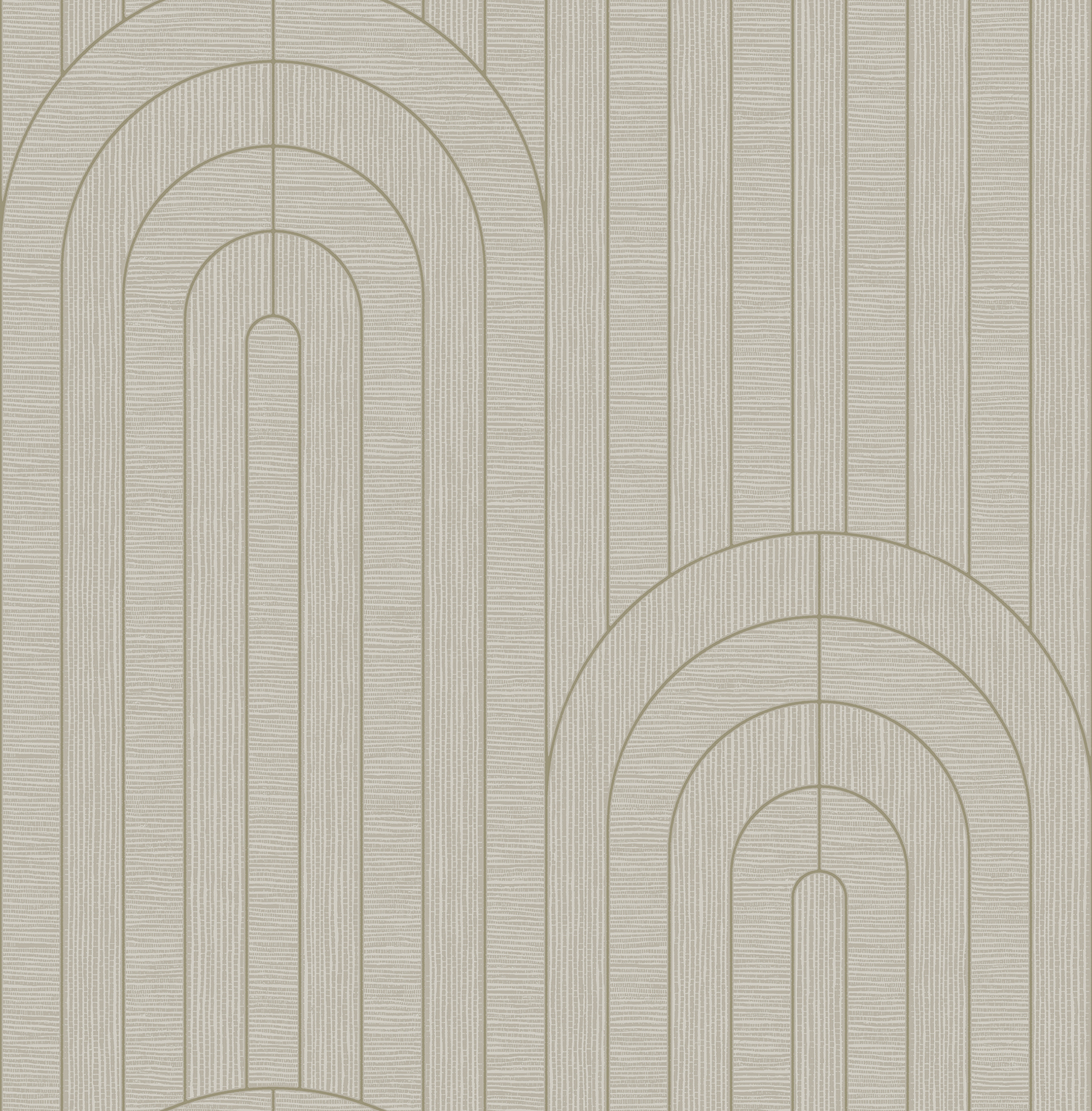 Concentric arches are enriched with glamorous details including metallic accents and tactile, textural finishes. Seen here with a sterling pearlescent ground and each arch outlined in pale metallic gold. Declan is an unpasted, non woven wallpaper measuring 20.5 inches wide by 33 feet long, covering approximately 56.4 square feet per roll.