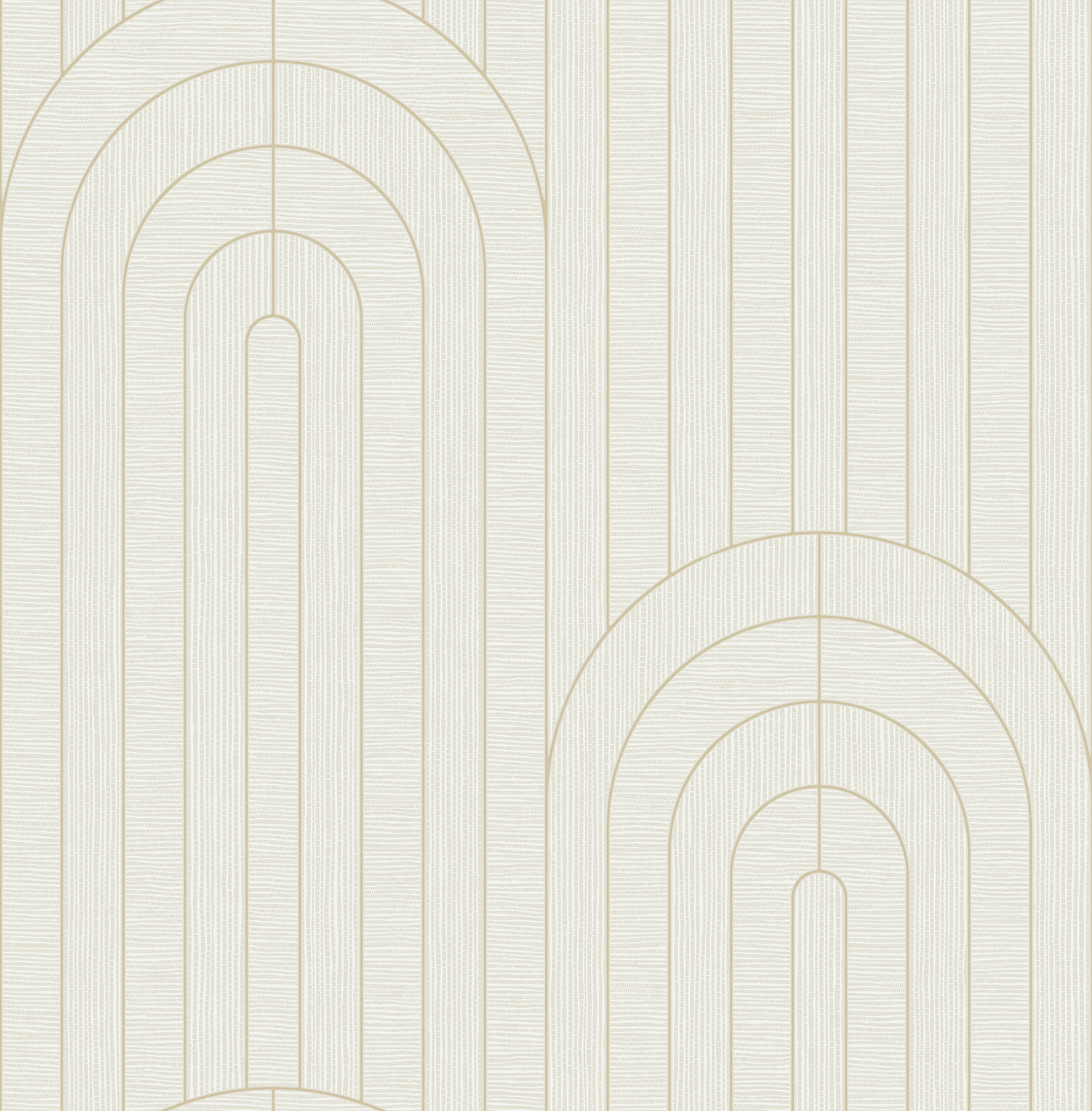 Concentric arches are enriched with glamorous details including metallic accents and tactile, textural finishes. Seen here with a pearlescent white ground and each arch outlined in metallic gold. Declan is an unpasted, non woven wallpaper measuring 20.5 inches wide by 33 feet long, covering approximately 56.4 square feet per roll.
