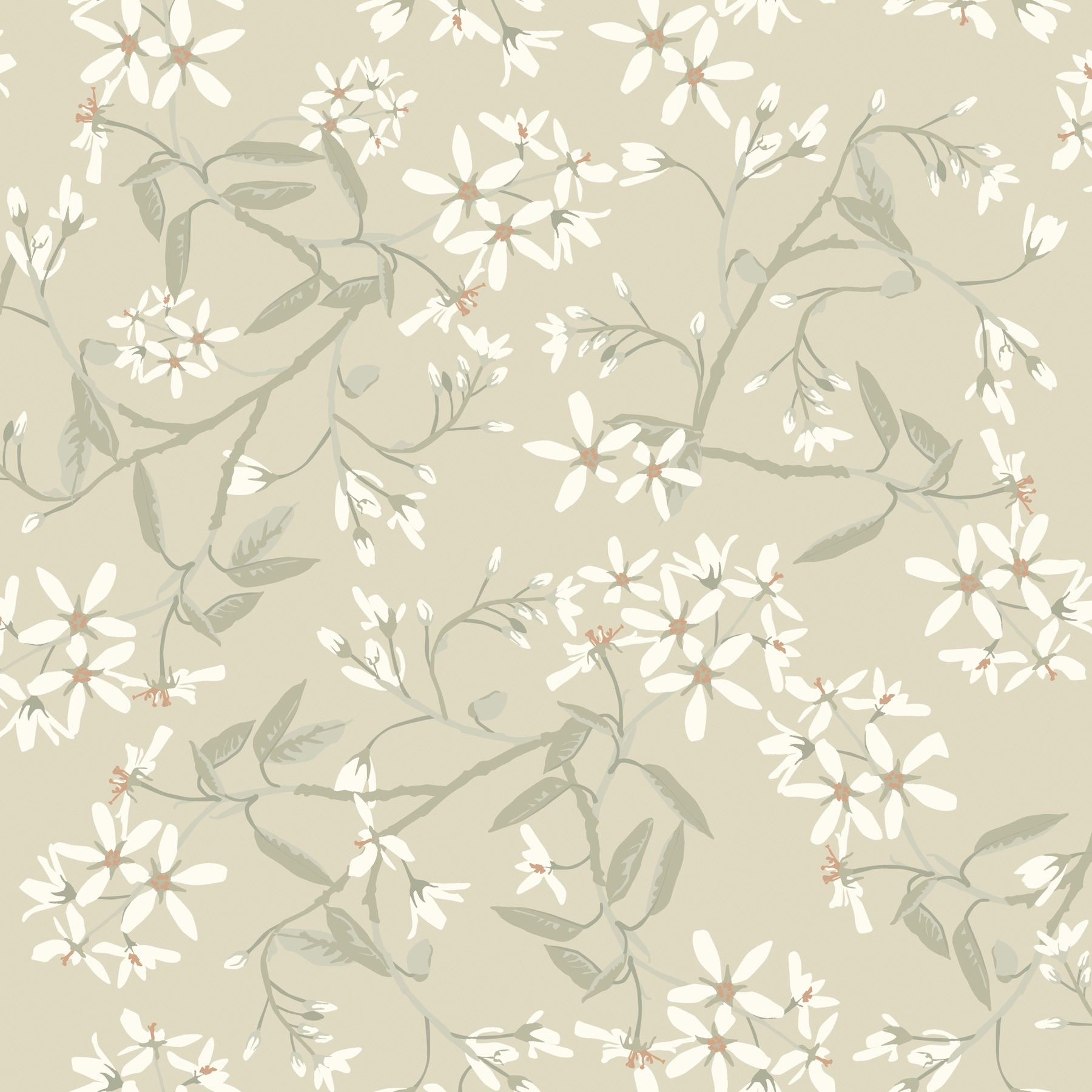 This airy floral wallpaper features delicate, star-shaped blossoms and spindly stems studded with oblong leaves. Seen here in a palette of white, grey, rose, and beige. Paradis is an unpasted, non woven wallpaper measuring 20.9 inches wide by 33 feet long, covering approximately 57.5 square feet per roll.