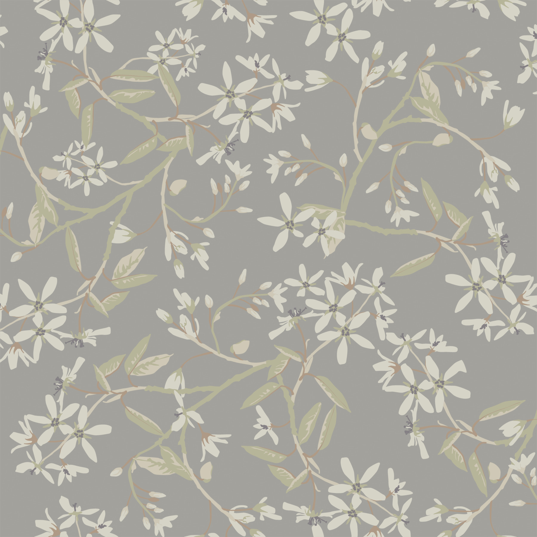 This airy floral wallpaper features delicate, star-shaped blossoms and spindly stems studded with oblong leaves. Seen here in a palette of off-white, beige, sage, rose, and grey. Paradis is an unpasted, non woven wallpaper measuring 20.9 inches wide by 33 feet long, covering approximately 57.5 square feet per roll.