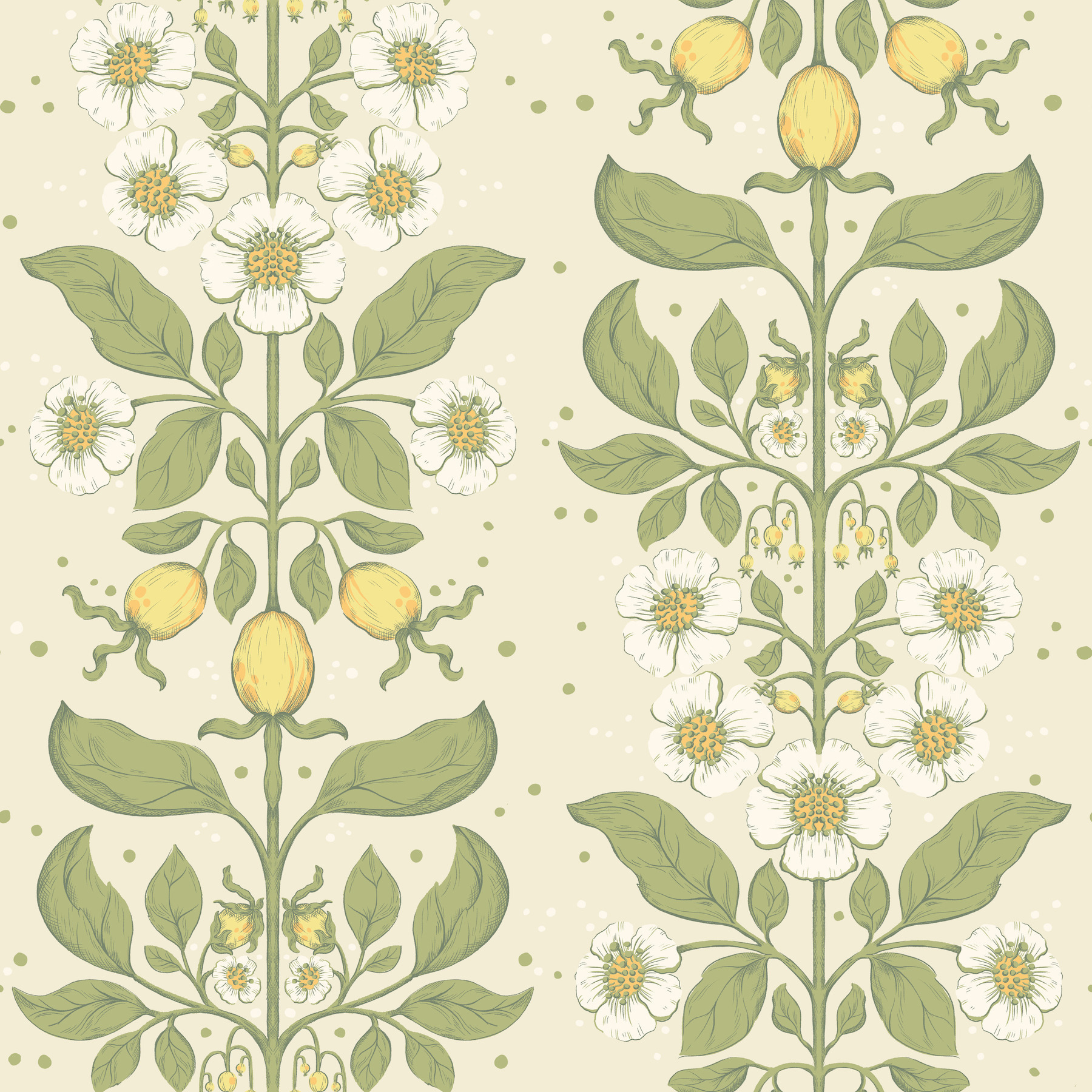 Flowers and fruits alternate along straight, stately vines in this stunning botanical design. The florals are inked in white and mustard, the fruits in pale yellow and orange, and the vines in sage, all offset against a cream backdrop speckled with sage and white. Rosa is an unpasted, non woven wallpaper measuring 20.9 inches wide by 33 feet long, covering approximately 57.5 square feet per roll.