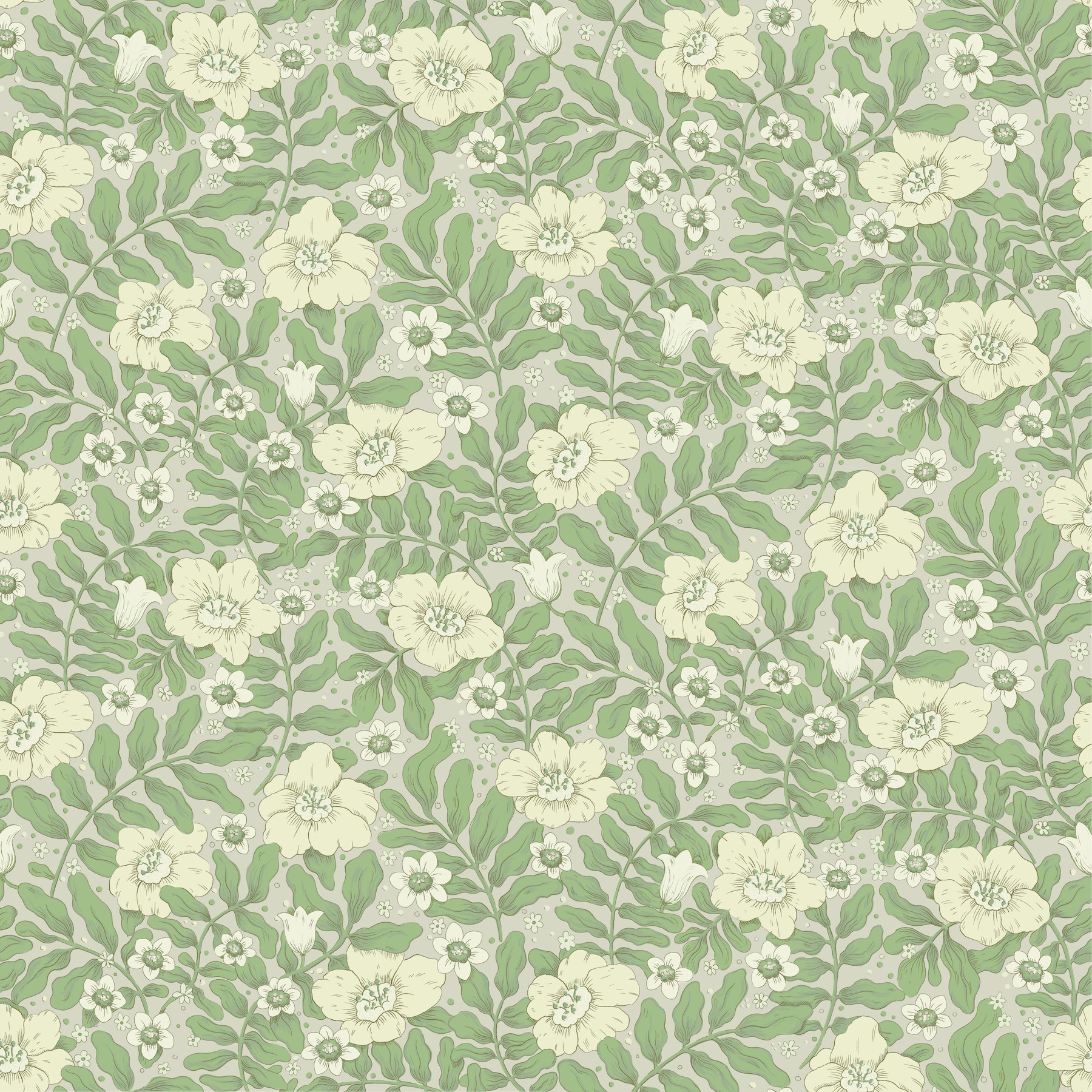 A cheerful riot of flowers are framed by winding ferns in this charming floral print. The blooms are inked in ivory and palest green, the leaves vibrant jade, and the backdrop light grey. Maggan is an unpasted, non woven wallpaper measuring 20.9 inches wide by 33 feet long, covering approximately 57.5 square feet per roll.