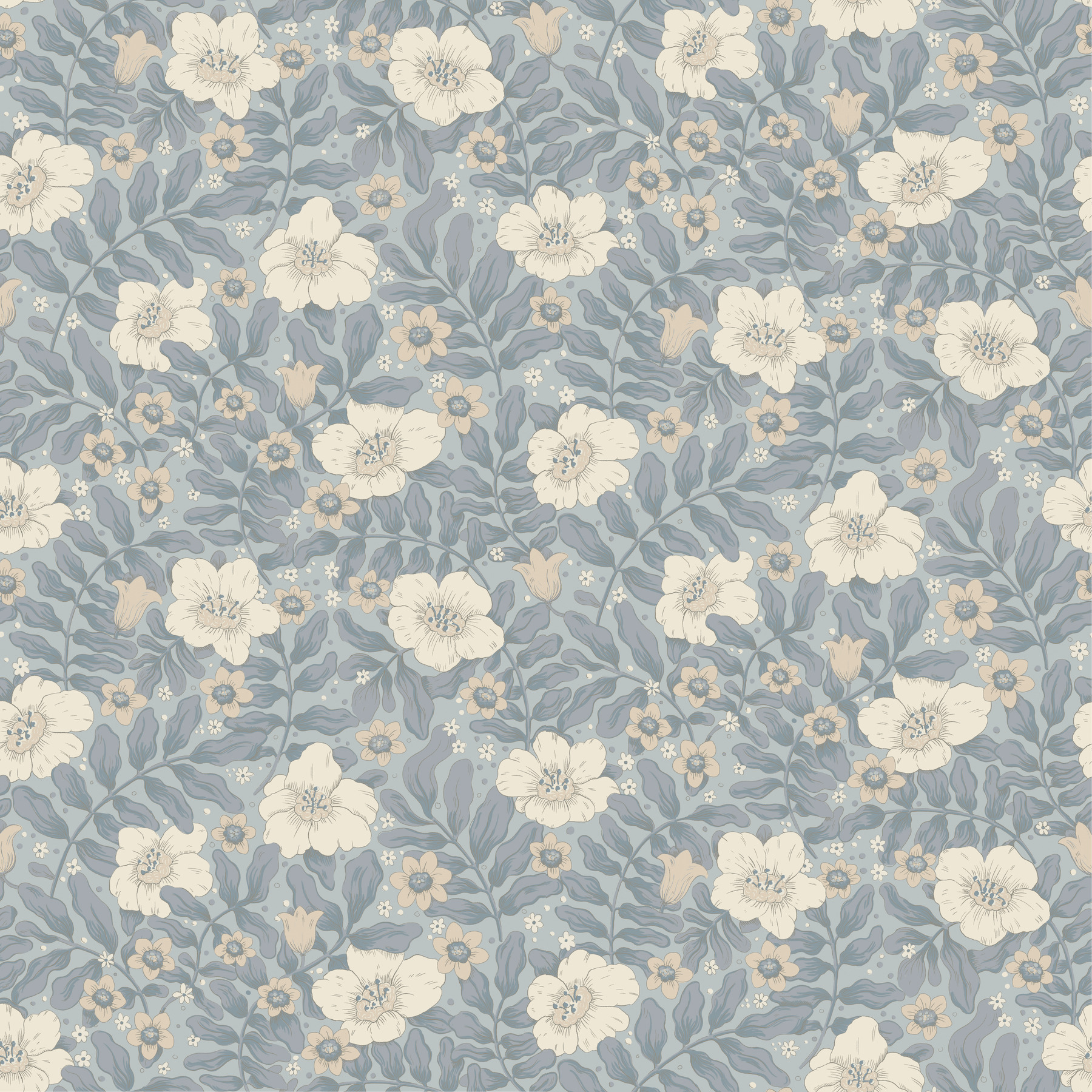 A cheerful riot of flowers are framed by winding ferns in this charming floral print. The blooms are inked in ivory and pale peach, the leaves indigo and steel blue, and the backdrop pale blue. Maggan is an unpasted, non woven wallpaper measuring 20.9 inches wide by 33 feet long, covering approximately 57.5 square feet per roll.